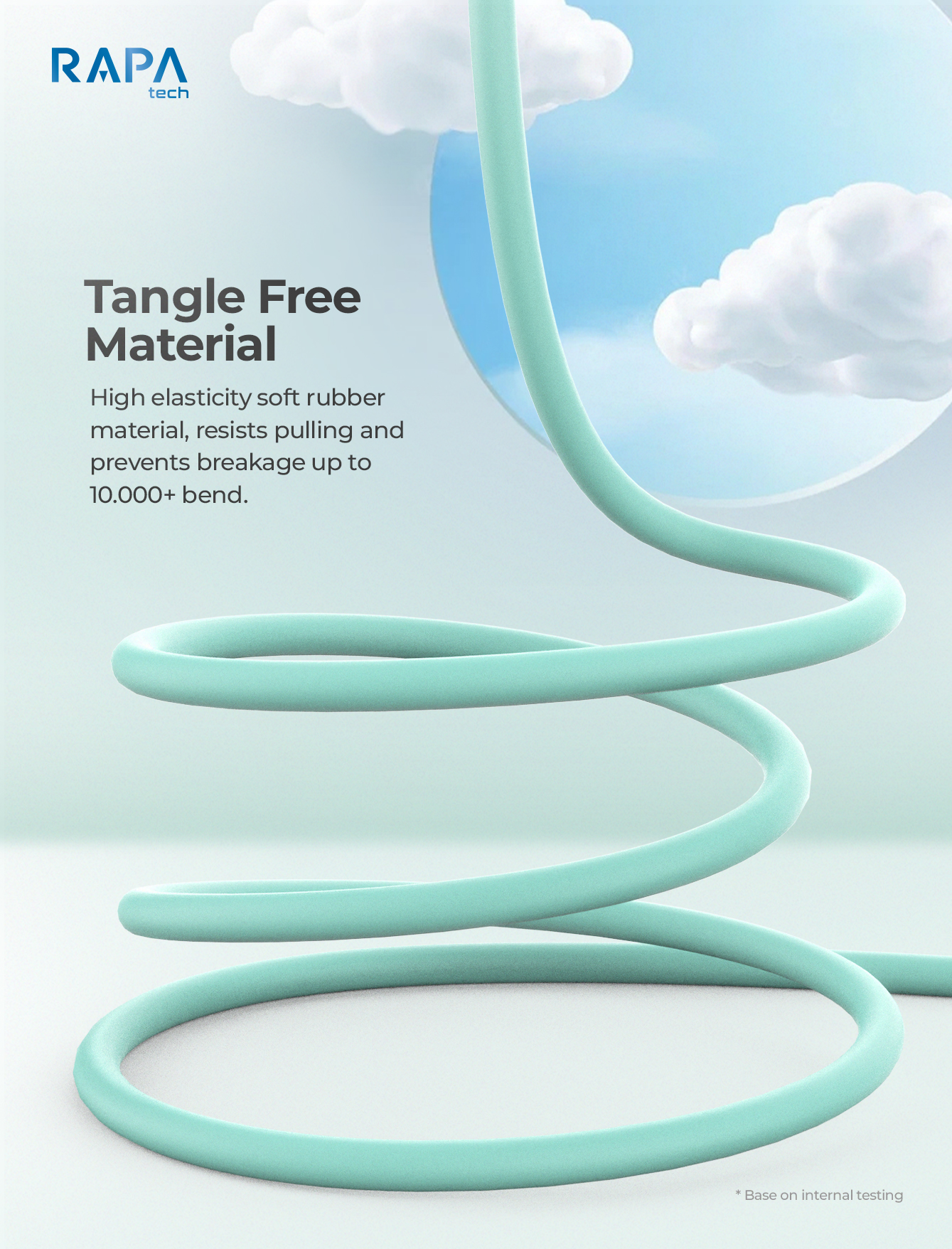 High elasticity soft rubber material, resists pulling and prevents breakage up to 10.000+ bend.