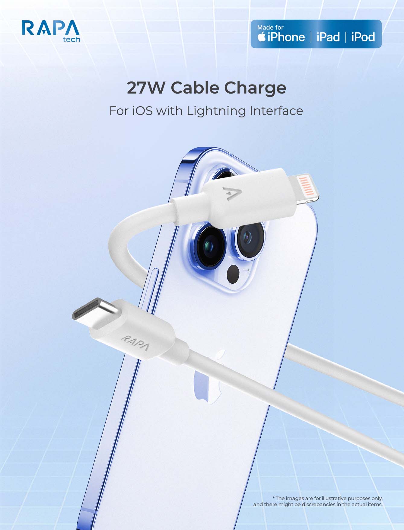MFi Certified to work securely with all your Lightning devices, including iPod, iPhone and iPad. Support Quick Charging up to 27W. Safely charge your device at its highest speed when connected to a Power Delivery high-speed charger. You can log in to the official MFi Licensed Accessories and search our brand “RAPA tech” or product model number of this term to confirm.