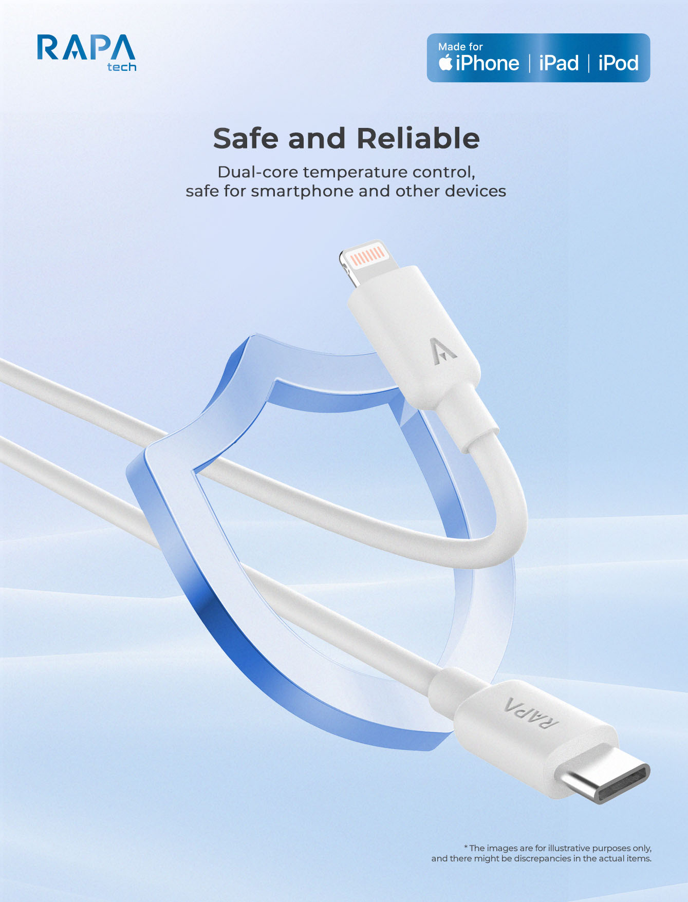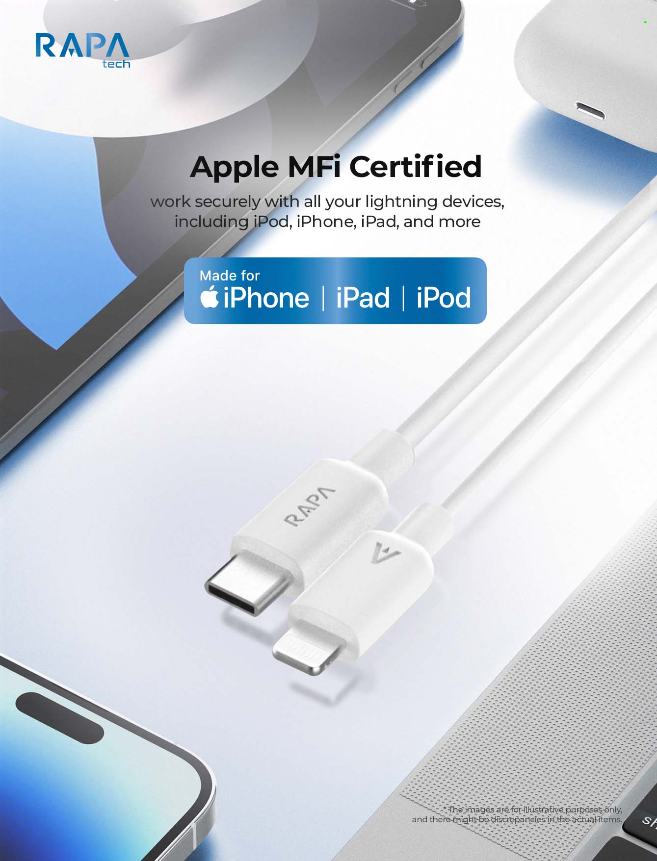 MFi Certified to work securely with all your Lightning devices, including iPod, iPhone and iPad. Support Quick Charging up to 27W. Safely charge your device at its highest speed when connected to a Power Delivery high-speed charger. You can log in to the official MFi Licensed Accessories and search our brand “RAPA tech” or product model number of this term to confirm.